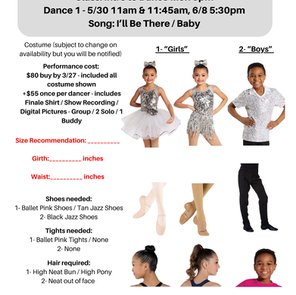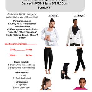 There are a few additions needed with costumes (Ballet "Girls" - pink ballet tights & pink ballet shoes; Ballet "Boys" - black ballet tights & black ballet shoes; Hip-Hop - All Black Athletic Shoes; Hip-Hop "Boys" - all black pants; Jazz "Girls" - tan tights & tan jazz shoes; Jazz "Boys" - all black pants & black jazz shoes; Tap - all black tap shoes).